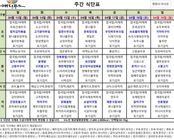 4월 둘째주 식단표 페이지 정보 작성자 은천노인복지회 작성일26-04-14 14:54 조회57회 댓글0건 관련링크 이전글 다음글 목록 답변 본문 4월 둘째주 어르신 식단표 안내해 드립니다. 정성과 영양을 담아 준비하겠습니다. 이전글 다음글 목록 답변