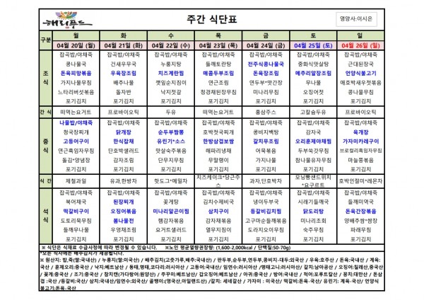 4월 셋째주 식단표 페이지 정보 작성자 은천노인복지회 작성일26-04-16 17:43 조회8회 댓글0건 관련링크 다음글 목록 답변 본문 4월 셋째주 어르신 식단표 안내해 드립니다. 정성과 영양을 담아 준비하겠습니다. 다음글 목록 답변