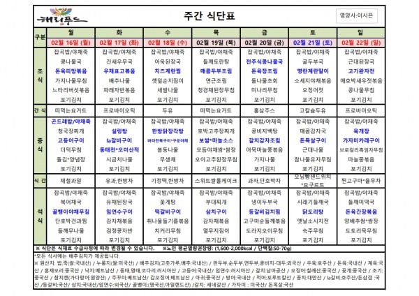 2월 셋째주 식단표 페이지 정보 작성자 은천노인복지회 작성일26-02-12 17:43 조회3,661회 댓글0건 관련링크 이전글 다음글 목록 답변 본문 2월 셋째주 어르신 식단표 안내해 드립니다. 정성과 영양을 담아 준비하겠습니다. 이전글 다음글 목록 답변