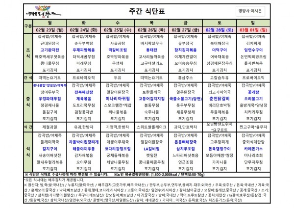 2월 넷째주 식단표 페이지 정보 작성자 은천노인복지회 작성일26-02-20 16:17 조회3,336회 댓글0건 관련링크 이전글 다음글 목록 답변 본문 2월 넷째주 어르신 식단표 안내해 드립니다. 정성과 영양을 담아 준비하겠습니다. 이전글 다음글 목록 답변