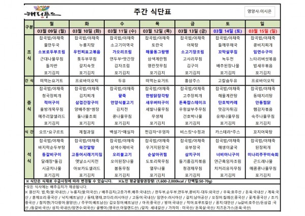 3월 둘째주 식단표 페이지 정보 작성자 은천노인복지회 작성일26-03-06 15:04 조회2,209회 댓글0건 관련링크 이전글 다음글 목록 답변 본문 3월 둘째주 어르신 식단표 안내해 드립니다. 정성과 영양을 담아 준비하겠습니다. 이전글 다음글 목록 답변