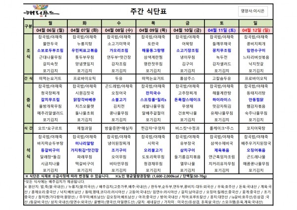 4월 첫째주 식단표 페이지 정보 작성자 은천노인복지회 작성일26-04-03 17:58 조회30회 댓글0건 관련링크 다음글 목록 답변 본문 4월 첫째주 어르신 식단표 안내해 드립니다. 정성과 영양을 담아 준비하겠습니다. 다음글 목록 답변