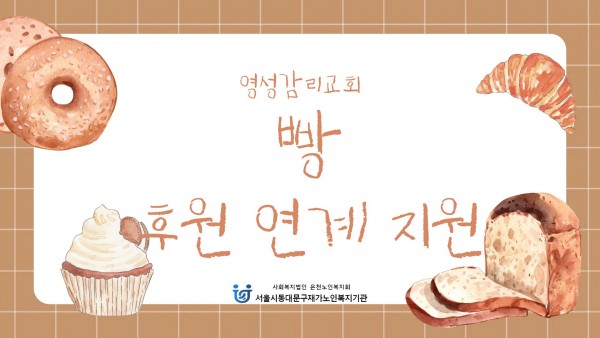 [재가노인지원서비스] 2026년 3월 영성감리교회(빵) 후원 페이지 정보 작성자 은천노인복지회 작성일26-04-06 11:18 조회28회 댓글0건 관련링크 이전글 다음글 목록 답변 본문 기관 인근에 위치한 '영성감리교회'에서 빵(단팥, 소보로, 완두앙금) 200개를 후원해주셨습니다. 이전글 다음글 목록 답변